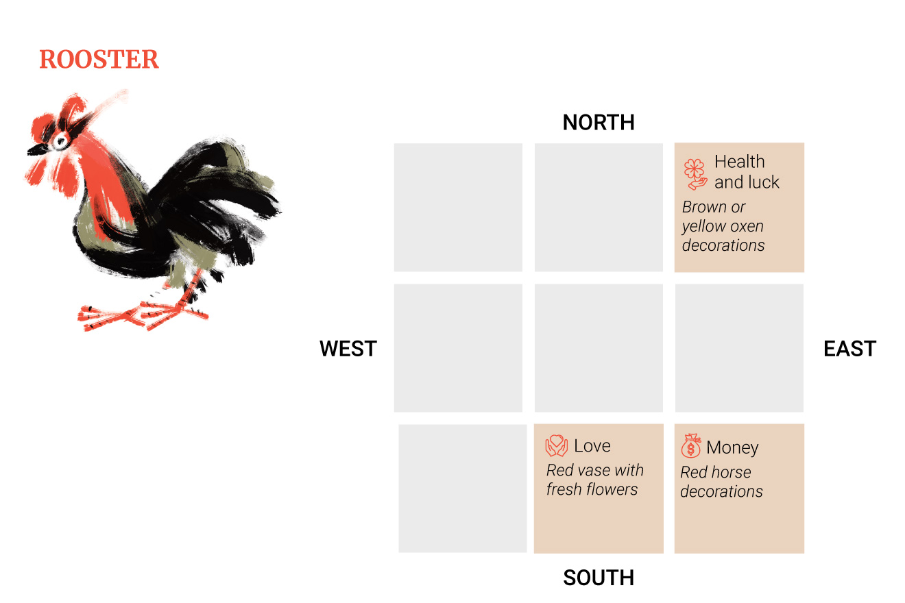 Η ερωτική στάση είναι στο νότο, επομένως οι Πετεινοί θα πρέπει να διακοσμήσουν αυτήν την περιοχή με ένα κόκκινο βάζο και φρέσκα λουλούδια.