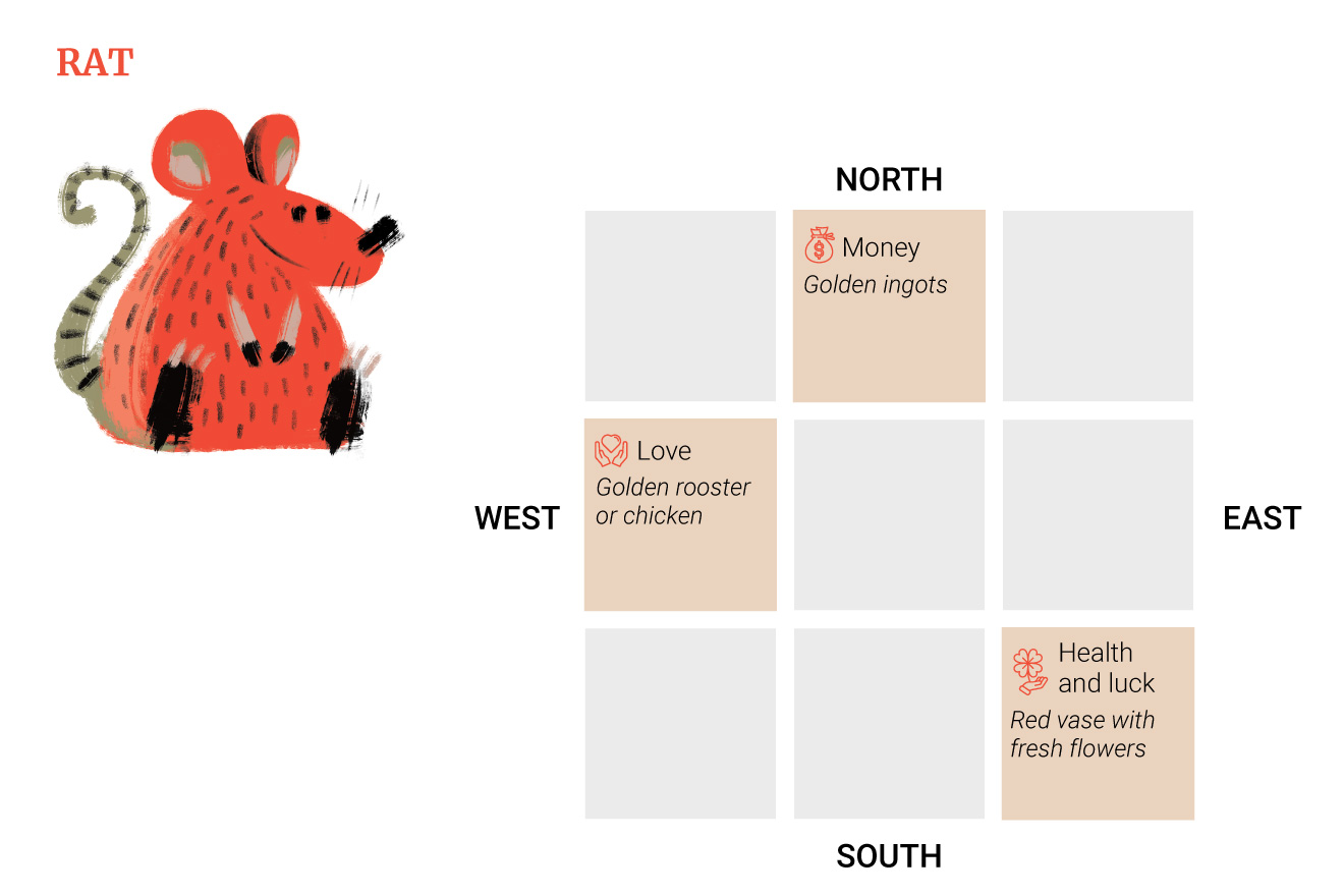 Η ερωτική στάση είναι στη δύση, επομένως οι αρουραίοι θα πρέπει να διακοσμήσουν αυτήν την περιοχή με χρυσά στολίδια με κόκορα ή κοτόπουλο.