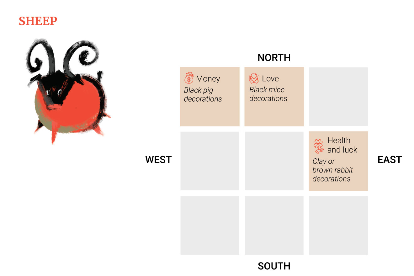 Η ερωτική στάση είναι στο βορρά, επομένως τα Πρόβατα πρέπει να διακοσμήσουν αυτήν την περιοχή με διακοσμήσεις από μαύρα ποντίκια.
