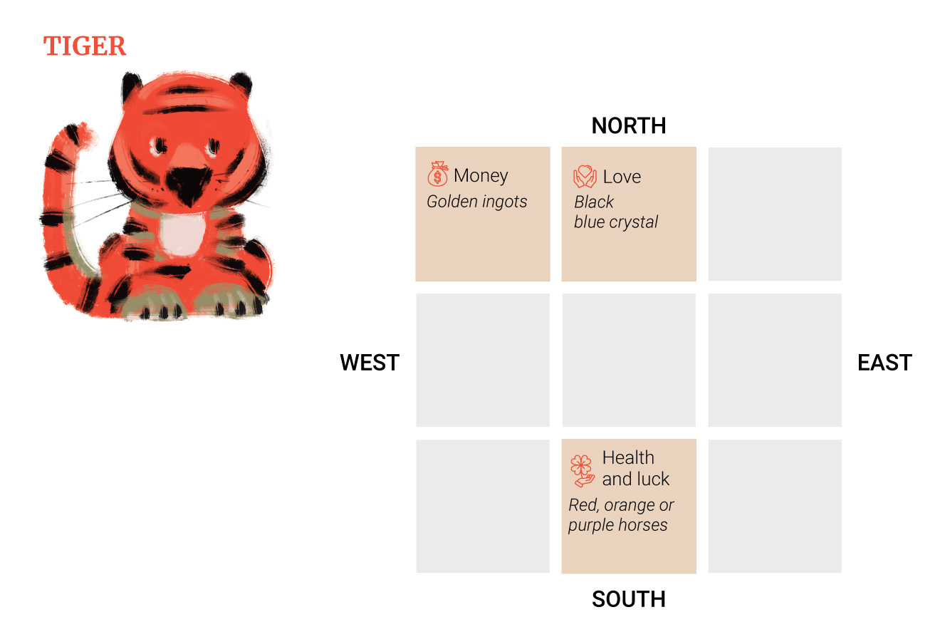 Η ερωτική θέση είναι στο βορρά, επομένως οι Τίγρεις θα πρέπει να διακοσμήσουν αυτήν την περιοχή με μαύρες ή μπλε κρυστάλλινες διακοσμήσεις.