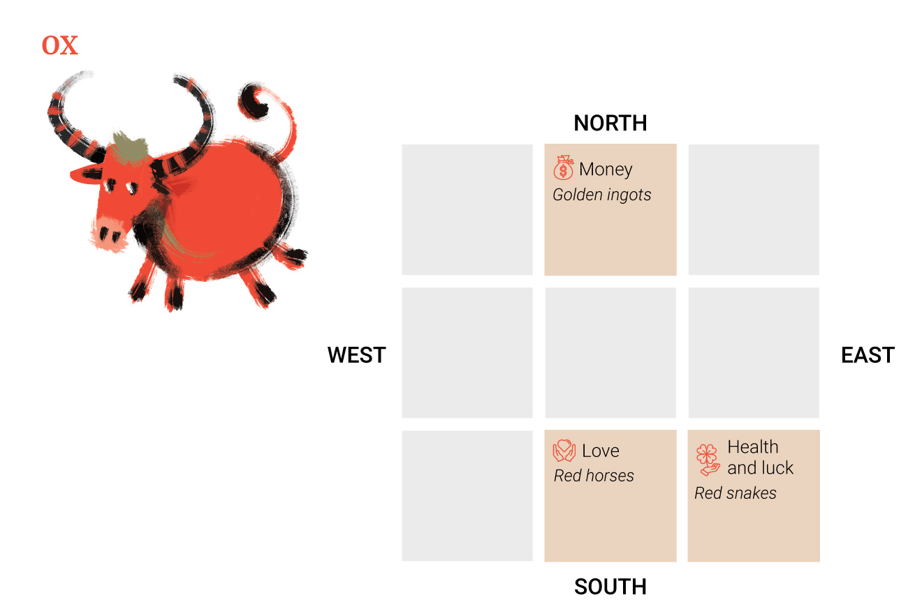 Η θέση για την ενίσχυση της υγείας και της γενικής τύχης βρίσκεται στα βορειοανατολικά, όπου πρέπει να τοποθετούνται καφέ ή κίτρινα διακοσμητικά βοδιών ή βόδια φτιαγμένα από πηλό.