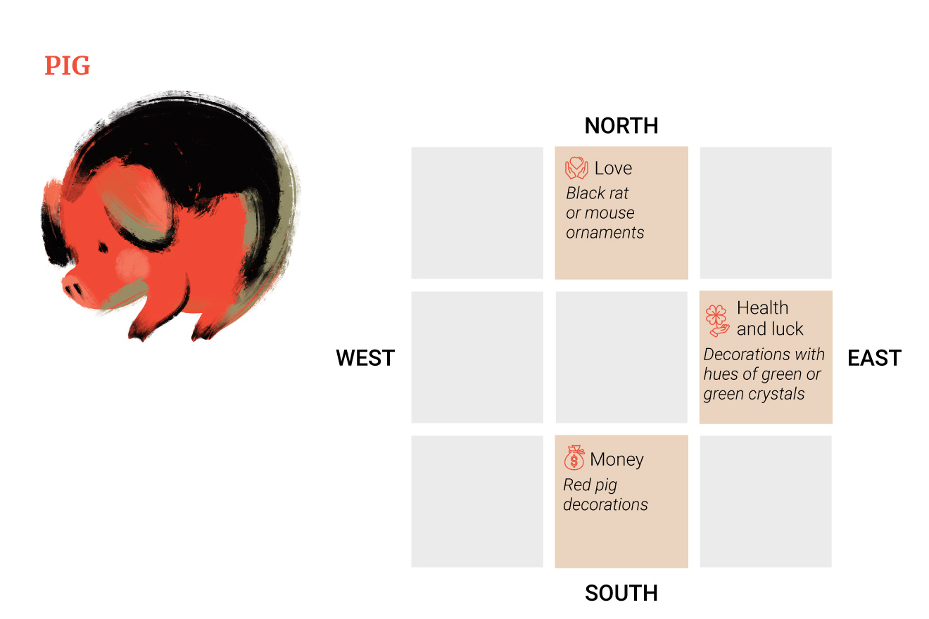 Η ερωτική στάση είναι στο βορρά, επομένως τα γουρούνια θα πρέπει να διακοσμήσουν αυτήν την περιοχή με μαύρα στολίδια με αρουραίους ή ποντίκια.