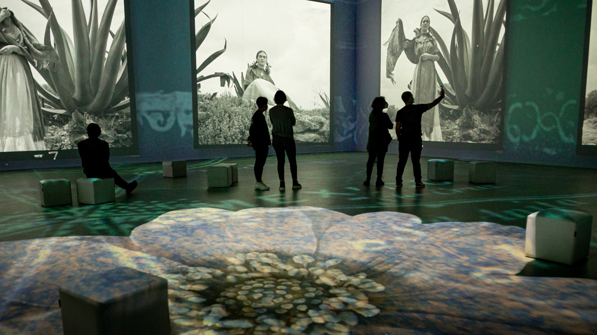 ΑΙΘΟΥΣΑ ΕΜΒΥΘΙΣΗΣ/IMMERSIVE EXPERIENCE: Η θεαματική οπτικοακουστική αφήγηση παρουσιάζει τα γεγονότα και τις εμπειρίες  που ανέδειξαν τη μοναδική ζωή της Φρίντα Κάλο και συνέβαλαν στη διαμόρφωσή της ως παγκόσμιου πολιτιστικού συμβόλου, μέσα από προβολές συνολικής επιφάνειας 500 τ.μ. με τη συνοδεία της μαγικής μουσικής του Ραφέλ Πλάνα (περιλαμβάνονται φωτογραφικό αρχειακό υλικό, ιστορικά ντοκουμέντα και απεικονίσεις χώρων που σημάδεψαν την προσωπική και ιστορική της διαδρομή)