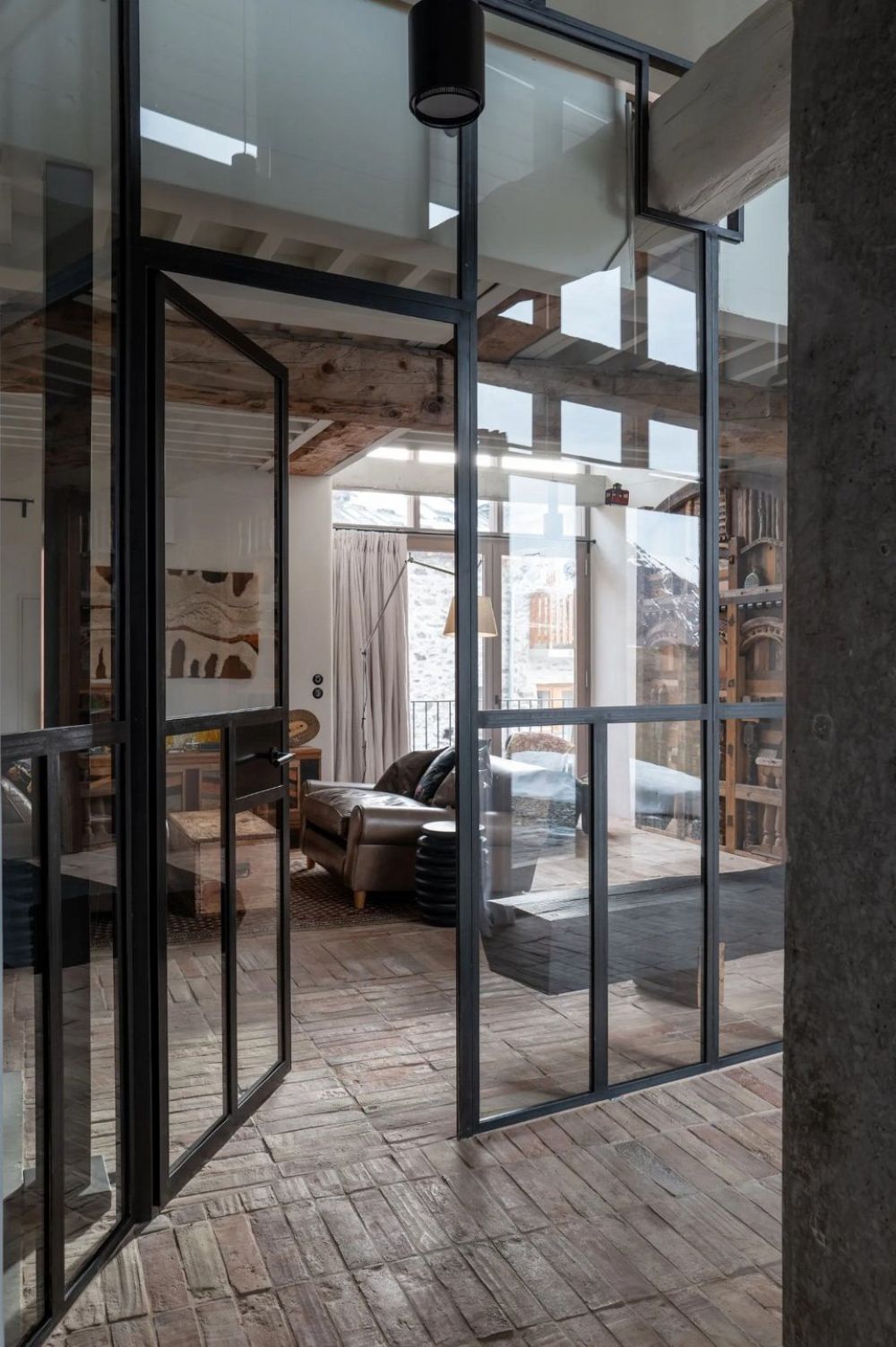 Ένα από τα πιο σημαντικά στοιχεία της νέας σχεδίασης είναι τα γυάλινα τοιχώματα που εκτείνονται σε όλο το ύψος του κτιρίου. Αυτά τα διαφανή διαχωριστικά λειτουργούν ως διακριτές γραμμές ανάμεσα στους θερμαινόμενους χώρους, επιτρέποντας μια αίσθηση οπτικής συνέχειας μεταξύ του ισογείου και του ορόφου, διατηρώντας παράλληλα την αίσθηση του φυσικού περιβάλλοντος που περιβάλλει το εξοχικό σπίτι.