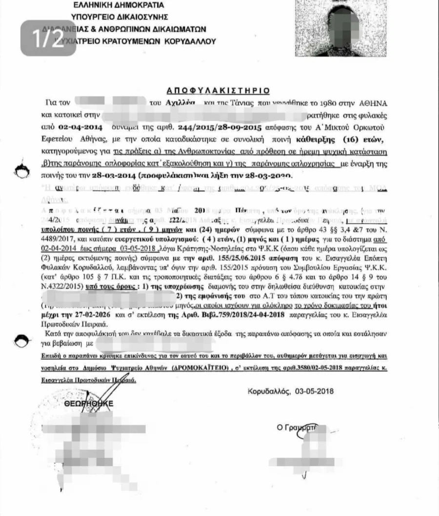 Όπως φαίνεται στο έγγραφο, ο 46χρονος αποφυλακίστηκε με διάταξη του εισαγγελέα Πρωτοδικών Πειραιά, με αναστολή του υπολοίπου της ποινής, το οποίο ανερχόταν σε 7 έτη, 9 μήνες και 24 ημέρες.