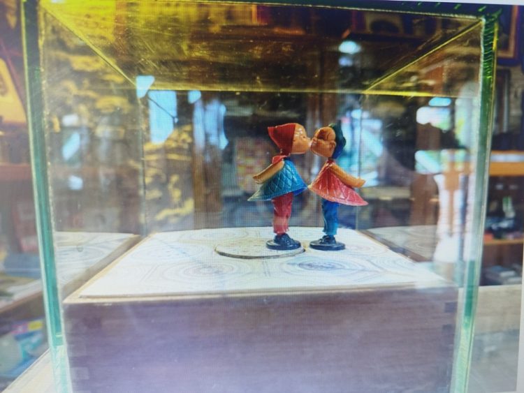 «Είναι ένα μικρό ζευγαράκι παιχνιδιών – αγόρι και κορίτσι – με ρούχα της εποχής. Είναι πλαστικά ανθρωπάκια, πάνω σε ένα ξύλινο κουτί που έχει έναν μηχανισμό ο οποίος περιστρέφει το κομμάτι που γυρίζει η μπαλαρίνα ενώ ο χορευτής είναι σταθερός . Έχουν και οι δυο μαγνήτη στο στόμα – πέρασαν χρόνια για να ανακαλύψουμε ότι χάρη σε αυτό ενώνουν τα στόματα τους και καταλήγουν στο φιλί – έμοιαζαν σα να κρατούν τον χρόνο ακίνητο», περιγράφει.