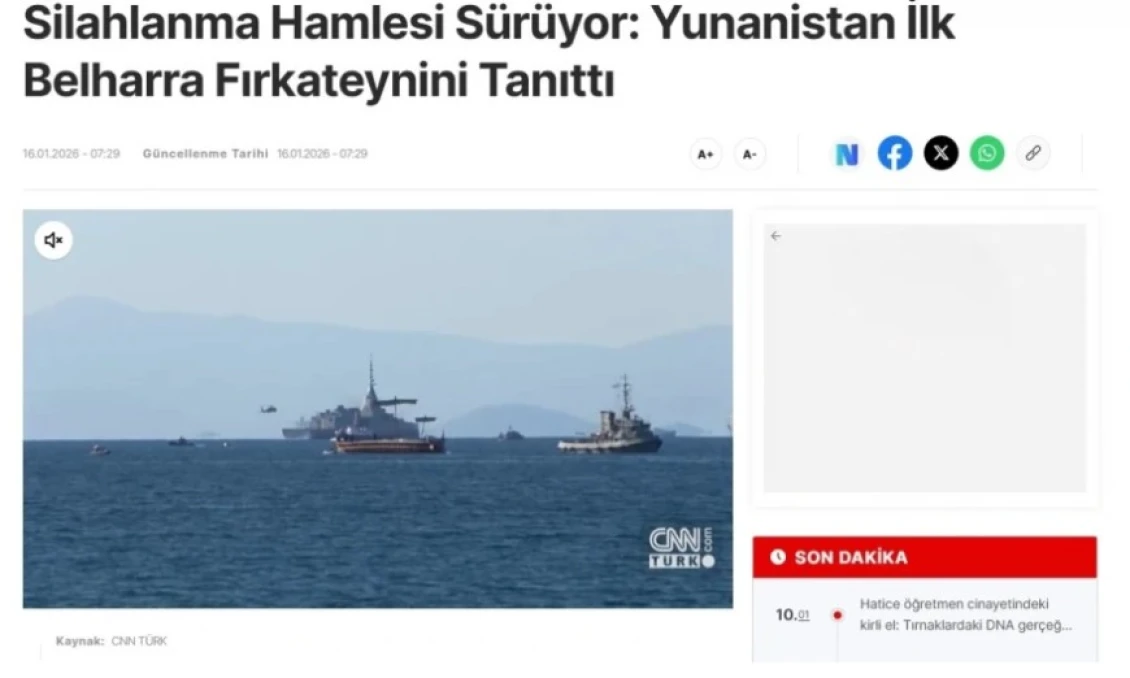 Στο δημοσίευμα αναγράφονται και οι τοποθετήσεις του Προέδρου της Δημοκρατίας, Κώστα Τασούλα, του πρωθυπουργού, Κυριάκου Μητσοτάκη και του υπουργού Άμυνας, Νίκου Δένδια, με το CNN TÜRK να παρουσιάζει τις δυνατότητες του «Κίμωνα», της πλέον σύγχρονης φρεγάτας του κόσμου, αλλά και τον χρονικό ορίζοντα των επόμενων κινήσεων για τη «θωράκιση» της ελληνικής Άμυνας.