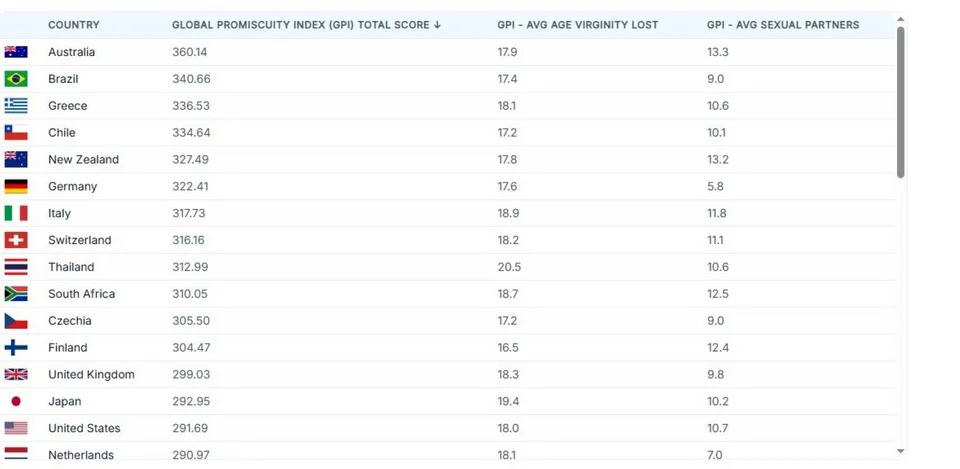 Σύμφωνα με στοιχεία της World Population Review, χώρες όπως η Αυστραλία, η Βραζιλία και η Ελλάδα κατατάσσονται ανάμεσα στις πιο σεξουαλικά απελευθερωμένες – ή αλλιώς «άτακτες» – χώρες του πλανήτη, βάσει του Διεθνούς Δείκτη Σεξουαλικού Φιλελευθερισμού (Global Promiscuity Index – GPI).