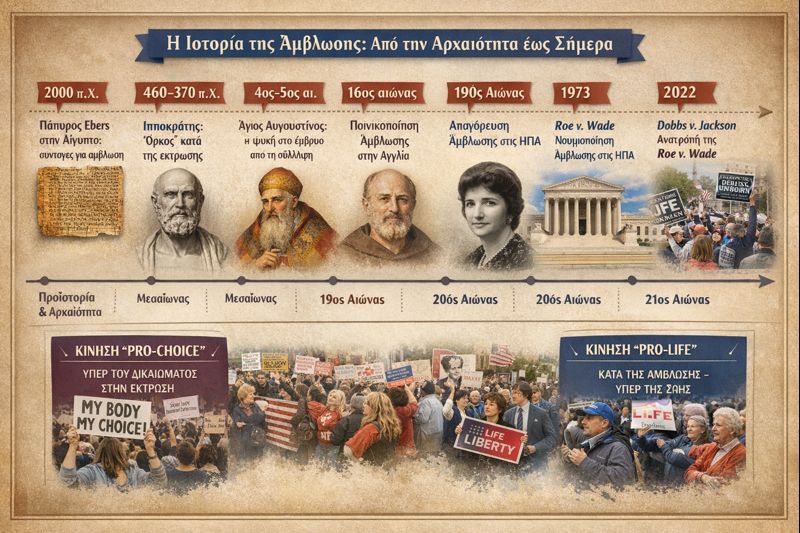 Από τα πρώτα φυτικά εκχυλίσματα έως τις σύγχρονες διαδηλώσεις για τα δικαιώματα της γυναίκας, η πορεία της άμβλωσης δείχνει πώς οι κοινωνίες έχουν διαμορφώσει την αναπαραγωγική αυτονομία, με συνεχείς συγκρούσεις ανάμεσα στην ατομική ελευθερία και τις κοινωνικές, πολιτικές και θρησκευτικές πιέσεις.