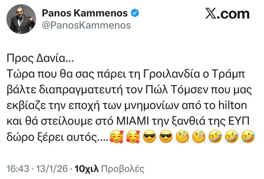 Ο Πάνος ο Καμμένος χτύπησε ξανά, φίλες και φίλοι! «Ξέρει αυτός»… Με τη μόνιμη επωδό των τελευταίων αναρτήσεών του, αυτή τη φορά σχετικά με τα σχέδια του προέδρου των ΗΠΑ για τη Γροιλανδία.