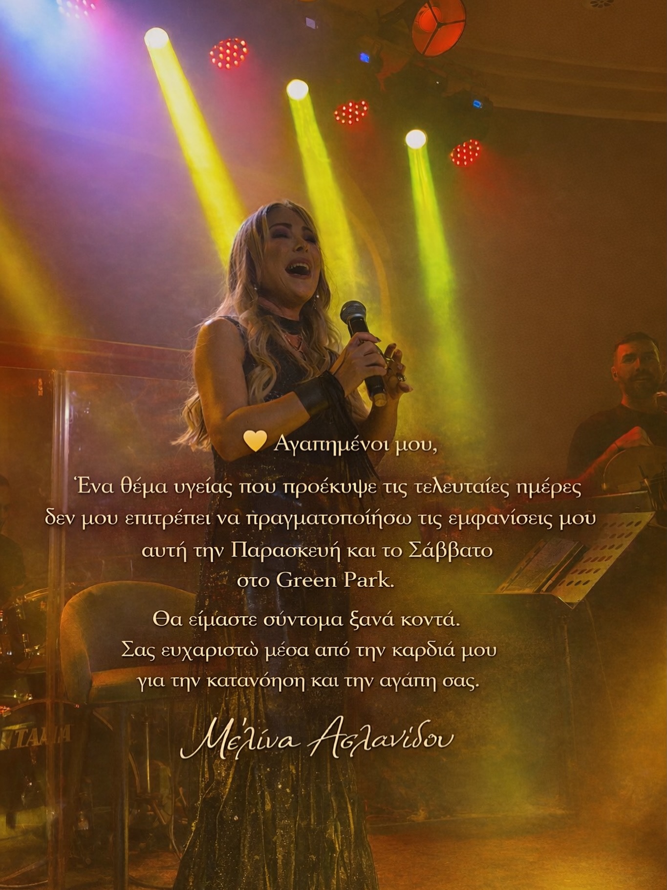 Η Μελίνα Ασλανίδου ενημέρωσε τους θαυμαστές της ότι ένα ξαφνικό θέμα υγείας δεν της επιτρέπει να πραγματοποιήσει τις προγραμματισμένες εμφανίσεις της αυτή την Παρασκευή και το Σάββατο στο Green Park.