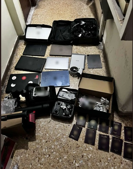 Σε έρευνες που πραγματοποιήθηκαν, συνολικά βρέθηκαν και κατασχέθηκαν: περισσότερα από 9.600 φαρμακευτικά δισκία, 36 πιστοποιητικά έγγραφα (ταυτότητες, διαβατήρια, διπλώματα), 6 laptop, 2 tablet, 3 drones, παιχνιδομηχανή, ηλεκτρικό πατίνι, φωτογραφική μηχανή, 3 κινητά και πλήθος εγγράφων.