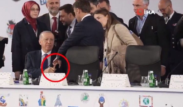 Στα πλάνα που κυκλοφόρησαν στα κοινωνικά δίκτυα και έγιναν σύντομα viral, διακρίνεται ο πρόεδρος της Γαλλίας να πλησιάζει τον Τούρκο πρόεδρο, ο οποίος είναι καθισμένος, και να του απλώνει το χέρι με φιλική διάθεση. Όμως, η εξέλιξη της στιγμής δεν ήταν αναμενόμενη: ο Ερντογάν όχι μόνο ανταποκρίθηκε, αλλά φαίνεται να πιάνει σφιχτά το δάχτυλο του Μακρόν, χωρίς να τον κοιτάξει απευθείας.