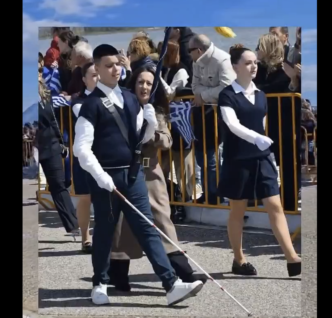 Ο Γιάννης, μαθητής με ολική απώλεια όρασης και αριστούχος της τάξης του, συγκίνησε για ακόμη μία φορά το πλήθος. Χιλιάδες θεατές τον υποδέχθηκαν με θερμό χειροκρότημα, αναγνωρίζοντας όχι μόνο την προσπάθειά του, αλλά και το παράδειγμα δύναμης που εκπέμπει. Δεν ήταν η πρώτη φορά που βρέθηκε στην κορυφή του σχηματισμού· είχε προηγηθεί η παρέλαση της 28ης Οκτωβρίου, όπου επίσης είχε τιμηθεί ως σημαιοφόρος χάρη στην υψηλότερη επίδοση της τάξης του. «Έβγαλα 19,7 και ένιωσα μεγάλη χαρά όταν μου ανακοίνωσαν ότι θα κρατήσω τη σημαία», είχε δηλώσει τότε.