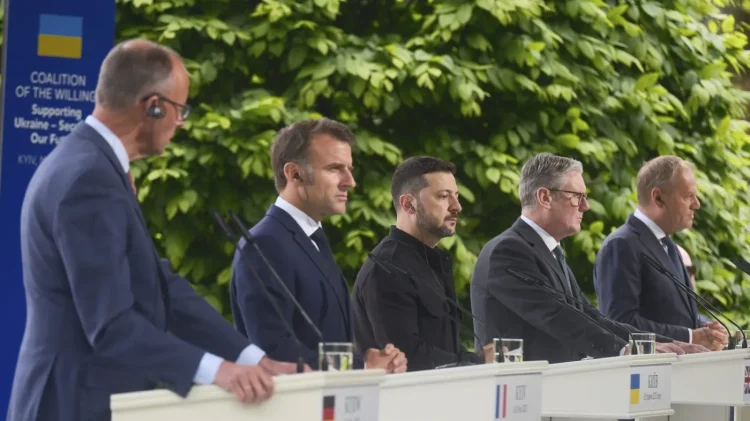 Η ανακοίνωση αυτή έγινε κατά την επίσκεψη που πραγματοποίησαν σήμερα στο Κίεβο οι ηγέτες της Γαλλίας Εμανουέλ Μακρόν, της Γερμανίας Φρίντριχ Μερτς, της Βρετανίας Κιρ Στάρμερ και της Πολωνίας Ντόναλντ Τουσκ, οι οποίοι δήλωσαν ότι έχουν εξασφαλίσει την υποστήριξη του Αμερικανού προέδρου Ντόναλντ Τραμπ – σε μια σπάνια επίδειξης ενότητας από τη Δύση.