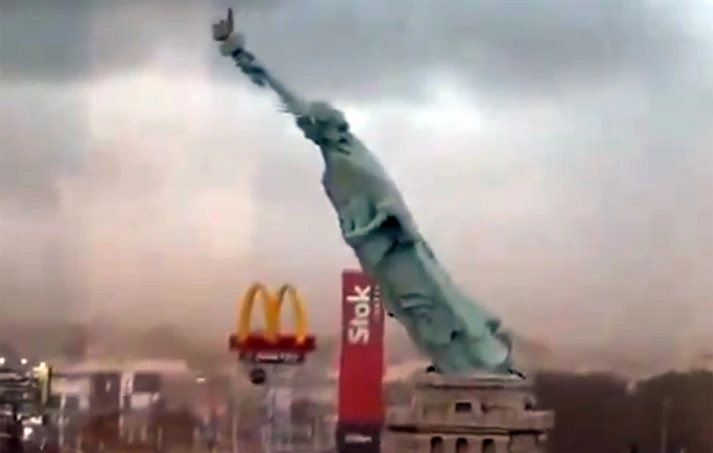 Το fake Άγαλμα της Ελευθερίας αρχικά πήρε κλίση και κατόπιν έπεσε από το βάθρο του. Ευτυχώς δεν υπάρχουν αναφορές για τραυματίες ή σοβαρές ζημιές.