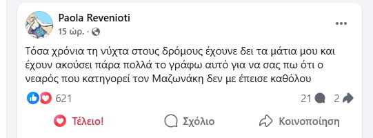 Η ακτιβίστρια Πάολα Ρεβενιώτη έγραψε σήμερα το πρωί πως: «Τόσα χρόνια τη νύχτα στους δρόμους έχουνε δει τα μάτια μου και έχουν ακούσει πάρα πολλά το γράφω αυτό για να σας πω ότι ο νεαρός που κατηγορεί τον Μαζωνάκη δεν με έπεισε καθόλου».