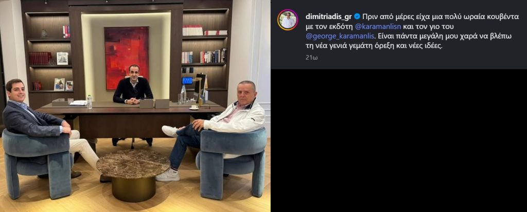 Η Political καταγράφει την κίνηση του Γρηγόρη Δημητριάδη, ο οποίος ανέβασε φωτογραφία από συνάντησή του με τον εκδότη της «Political» Νίκο Καραμανλή και τον γιο του Γιώργο Καραμανλή.