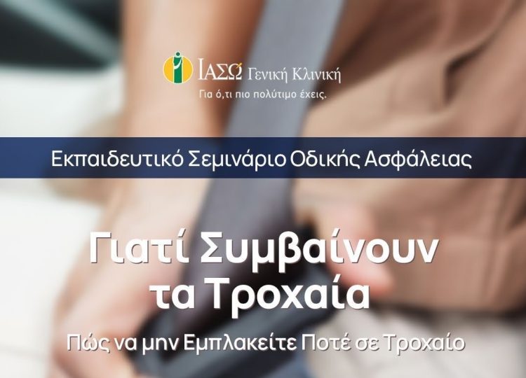 Το ΙΑΣΩ Γενική Κλινική, στο πλαίσιο των ενεργειών του προγράμματος Εταιρικής Κοινωνικής Ευθύνης του Ομίλου ΙΑΣΩ «δίπλα σας» και με στόχο την ευαισθητοποίηση του κοινού σε θέματα πρόληψης και ασφάλειας, διοργανώνει Εκπαιδευτικό Σεμινάριο Οδικής Ασφάλειας με τίτλο: «Γιατί Συμβαίνουν τα Τροχαία – Πώς να μην Εμπλακείτε Ποτέ σε Τροχαίο» και καλεί γονείς και εφήβους να το παρακολουθήσουν.