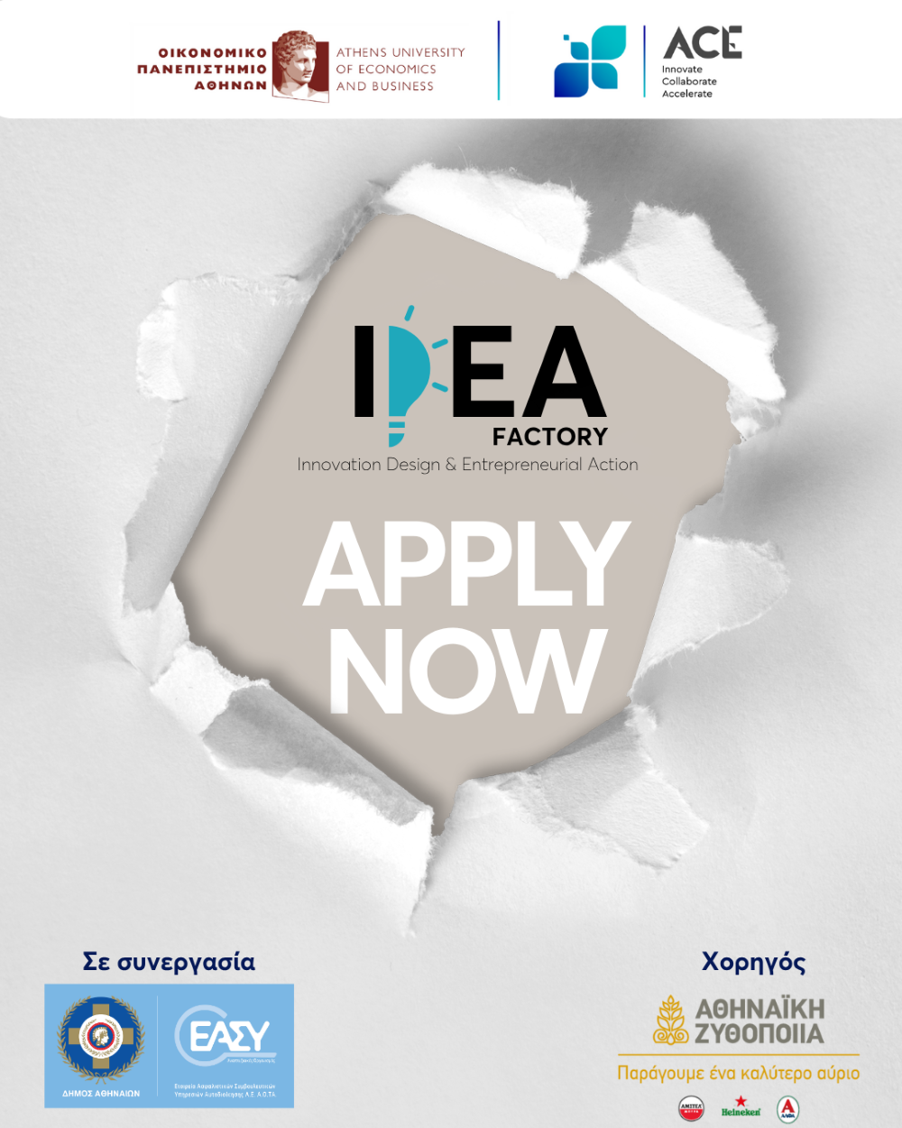 Αυτό το καινοτόμο πρόγραμμα υλοποιείται σε συνεργασία με τον Δήμο Αθηναίων, μέσω του Αναπτυξιακού Οργανισμού «ΕΑΣΥ Α.Ε. ΑΟΤΑ», και το Οικονομικό Πανεπιστήμιο Αθηνών. Οι πόρτες του IDEA FACTORY θα ανοίξουν στις 3 Νοεμβρίου, και μπορείς να δηλώσεις συμμετοχή έως τις 23 Οκτωβρίου.