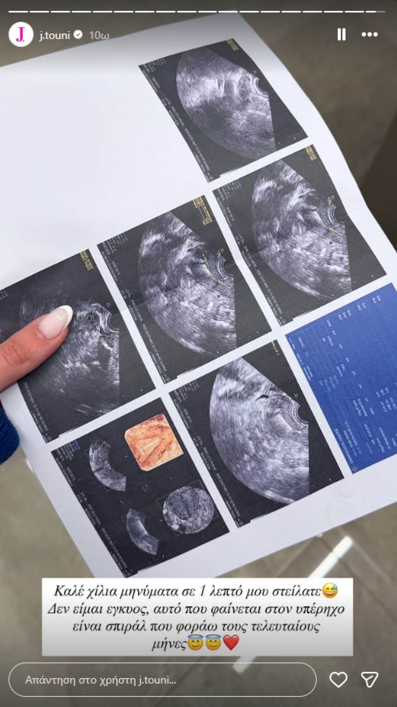 Θέλοντας να καθησυχάσει τους διαδικτυακούς της φίλους, η Ιωάννα Τούνη ξεκαθάρισε πως πρόκειται για ένα τυπικό check-up που κάθε γυναίκα οφείλει να κάνει: «Καλέ χίλια μηνύματα σε 1 λεπτό μου στείλατε. Δεν είμαι έγκυος, αυτό που φαίνεται στον υπέρηχο είναι σπιράλ που φοράω τους τελευταίους μήνες».