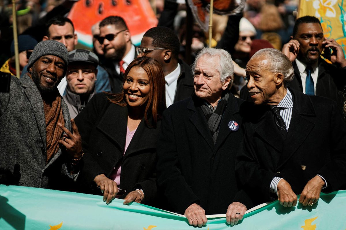 NOW: Robert DeNiro is leading the No Kings March in NYC, holding a banner alongside Attorney General Leticia James and Rev. Al Sharpton as they march down 7th Avenue in Manhattan