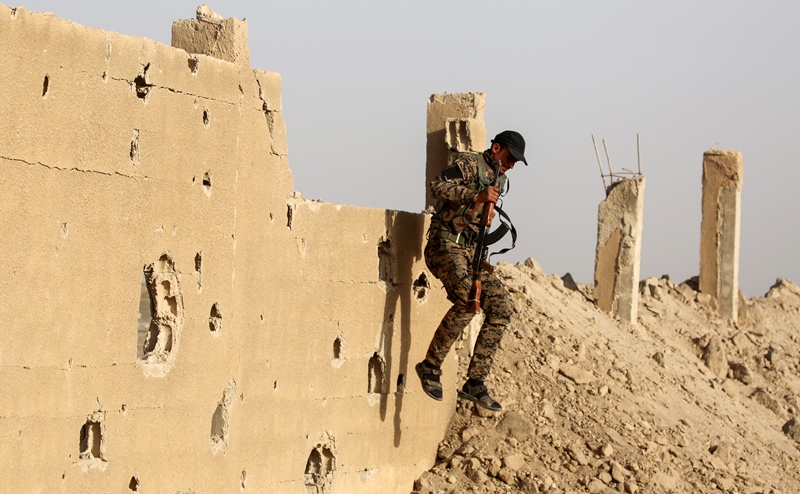 A member of the Kurdish People's Protection Units (YPG) jumps from a wall as he carries a Kalashnikov assault rifle in the town of al-Karamah, 26 kms from the Islamic State (IS) group bastion of Raqa, on May 10, 2017. / AFP PHOTO / DELIL SOULEIMAN