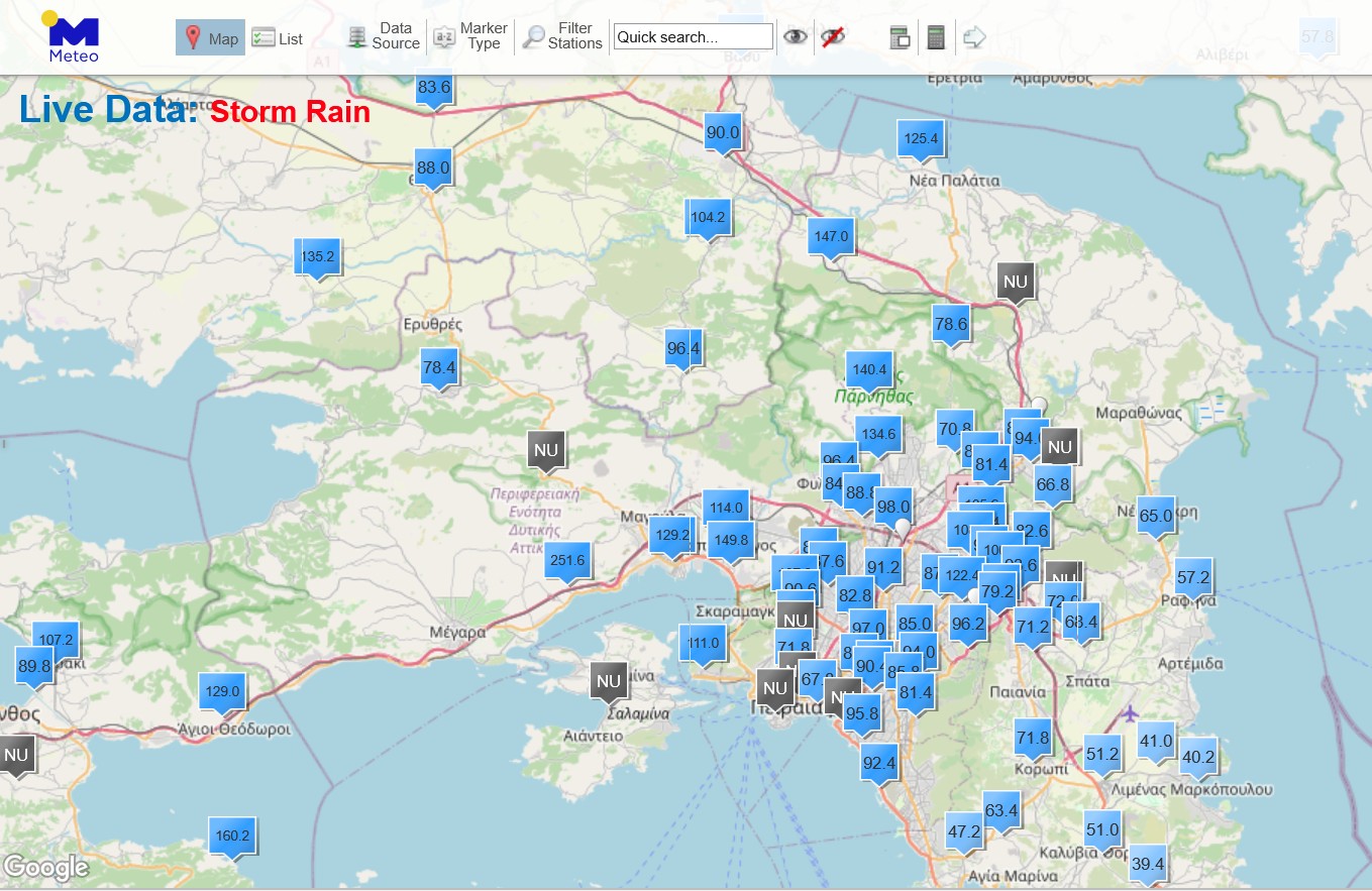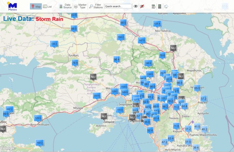 Σύμφωνα με το δίκτυο αυτόματων μετεωρολογικών σταθμών του Εθνικού Αστεροσκοπείου Αθηνών / Meteo.gr τα μεγαλύτερα ύψη βροχής μέχρι τις 10:40 καταγράφηκαν στην Βλυχάδα Αττικής με 135mm, ακολουθεί ο Αυλώνας Αττικής με 114mm και το Σίθι Λασιθίου με 90mm.