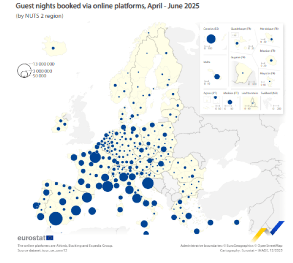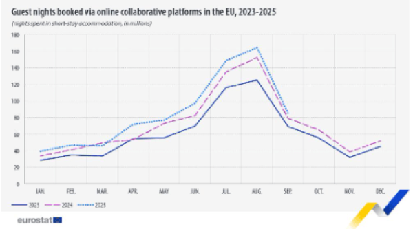 Σύμφωνα με τα νεότερα στοιχεία της Eurostat, κατά το τρίτο τρίμηνο του 2025, οι επισκέπτες διανυκτέρευσαν συνολικά 398,1 εκατομμύρια νύχτες σε βραχυχρόνια καταλύματα στην ΕΕ μέσω διαδικτυακών πλατφορμών. Ο αριθμός αυτός παρουσίασε αύξηση 8,7% σε σύγκριση με το αντίστοιχο τρίμηνο του 2024 και 28,2% σε σχέση με το τρίτο τρίμηνο του 2023.