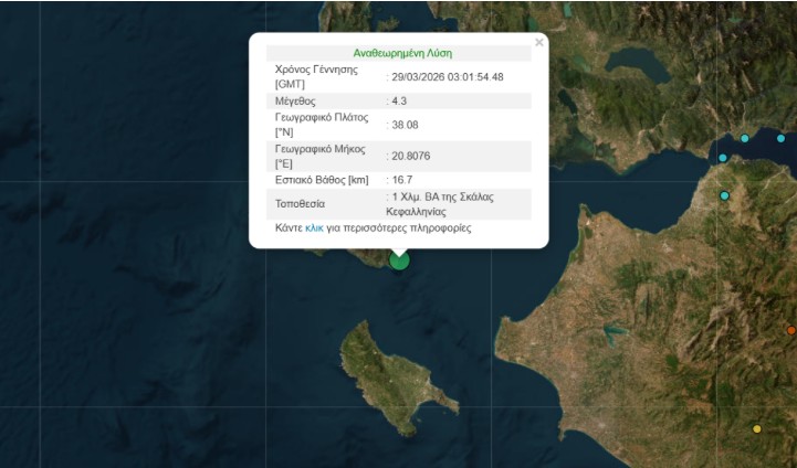 Το επίκεντρο του σεισμού, εντοπίστηκε 1χλμ. βορειοανατολικά της Σκάλας στην Κεφαλονιά.