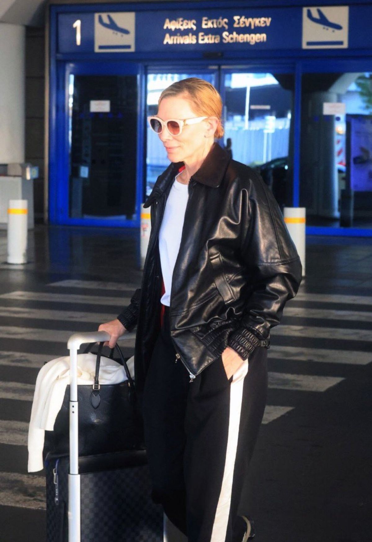 Η ηθοποιός, γνωστή παγκοσμίως, επέλεξε ένα απλό και ταυτόχρονα κομψό λουκ, φορώντας μια μαύρη φόρμα, δερμάτινο τζάκετ και αθλητικά παπούτσια, διατηρώντας έτσι ένα διακριτικό προφίλ. Σύντομα, θα κατευθυνθεί προς τη Μεσσηνία, συγκεκριμένα στην Καρδάμυλη, όπου θα πραγματοποιηθούν τα γυρίσματα.