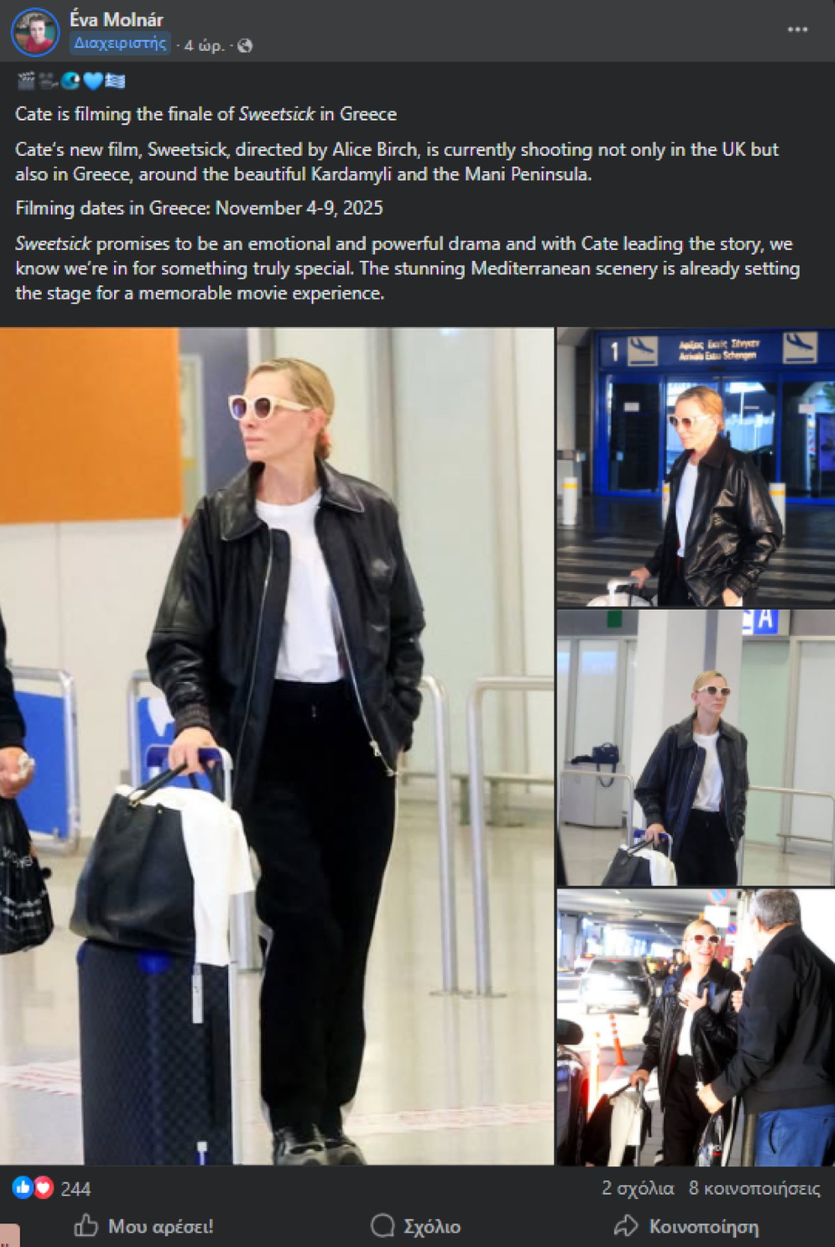 Η ηθοποιός, γνωστή παγκοσμίως, επέλεξε ένα απλό και ταυτόχρονα κομψό λουκ, φορώντας μια μαύρη φόρμα, δερμάτινο τζάκετ και αθλητικά παπούτσια, διατηρώντας έτσι ένα διακριτικό προφίλ. Σύντομα, θα κατευθυνθεί προς τη Μεσσηνία, συγκεκριμένα στην Καρδάμυλη, όπου θα πραγματοποιηθούν τα γυρίσματα.