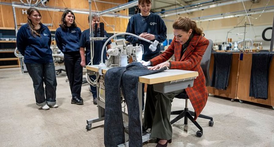 Η πιο ξεχωριστή στιγμή της επίσκεψης ήταν όταν η Κέιτ κάθισε μπροστά από μια ραπτομηχανή για να ολοκληρώσει ένα τζιν παντελόνι που προοριζόταν για τον πρίγκιπα Γουίλιαμ.