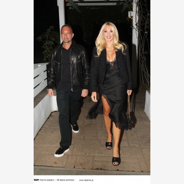 Η όμορφη παρουσιάστρια επέλεξε ένα total black ασύμμετρο lingerie φόρεμα με βαθύ ντεκολτέ, ψηλοτάκουνα mules και τσάντα στην ίδια απόχρωση, ολοκληρώνοντας ένα βραδινό look κομψό που μονοπώλησε τα βλέμματα των καλεσμένων αλλά και των φωτογράφων.