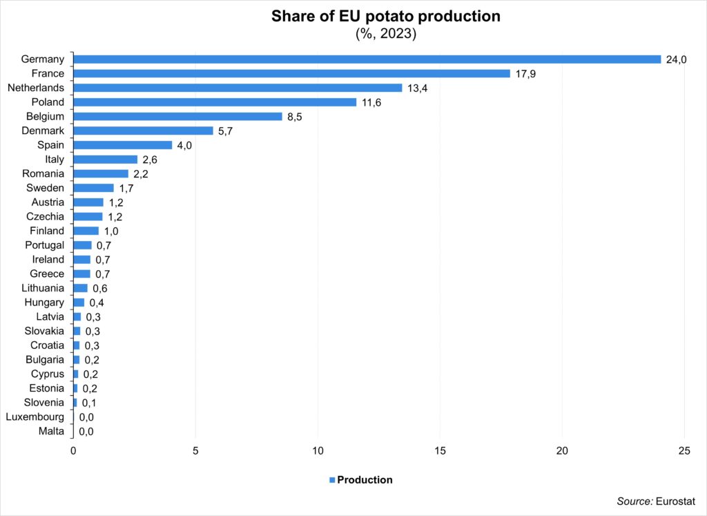 Γερμανία, Γαλλία, Ολλανδία παρήγαγαν το 2023 από κοινού περί το 55% της πατάτας στην Ευρωπαϊκή Ένωση. Η Ελλάδα το 0,7%, στα ίδια επίπεδα με την Ιρλανδία και την Πορτογαλία.