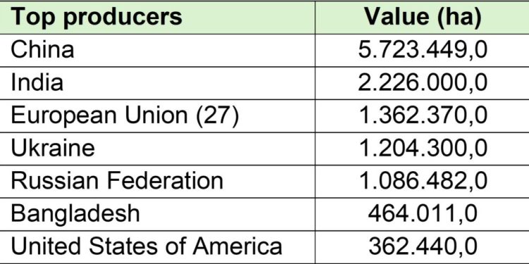 Οι μεγαλύτεροι παραγωγοί πατάτας στον κόσμο ανά εκτάρια γης είναι οι: Κίνα, Ινδία, Ευρωπαϊκή Ενωση, Ουκρανία, Ρωσική Ομοσπονδία (Ρωσία), Μπαγκλαντές, Ηνωμένες Πολιτείες Αμερικής (στοιχεία του 2023)
