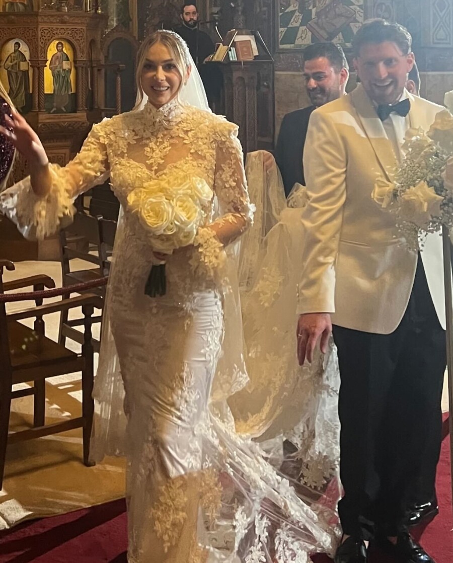 Το πρώην μοντέλο, έφτασε στην εκκλησία συνοδευόμενη από τον πατέρα της, επιλέγοντας ένα υπέροχο νυφικό σε ρομαντικό ύφος και στενή γραμμή, με μακρύ πέπλο. Το πέπλο της μάλιστα, είχε πάνω 3D λουλούδια!
