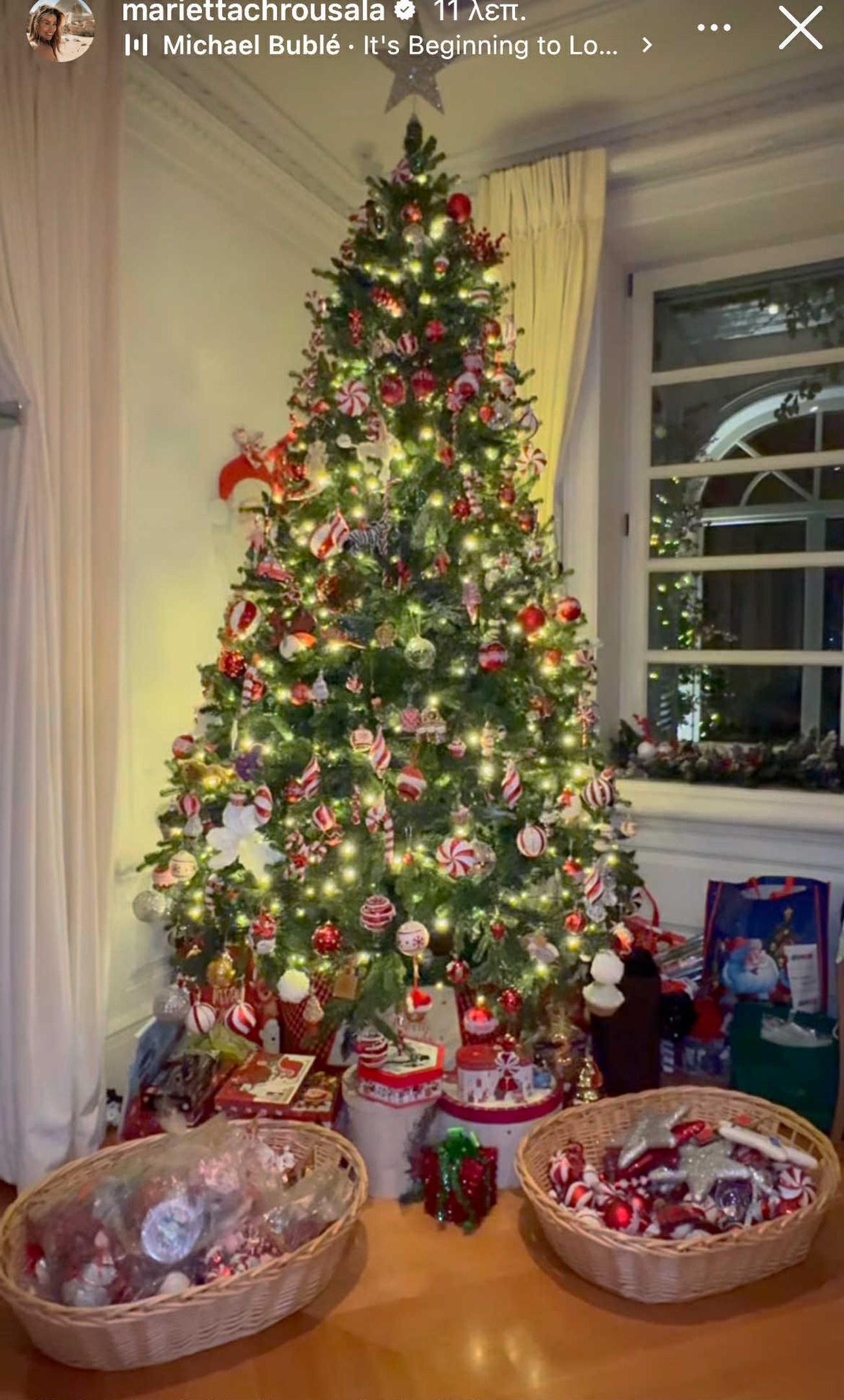 Το δέντρο στολίστηκε με κόκκινες και λευκές μπάλες, ενώ στη βάση του τοποθετήθηκαν ήδη τα πρώτα δώρα, προσθέτοντας μια ζεστή και γιορτινή νότα.
