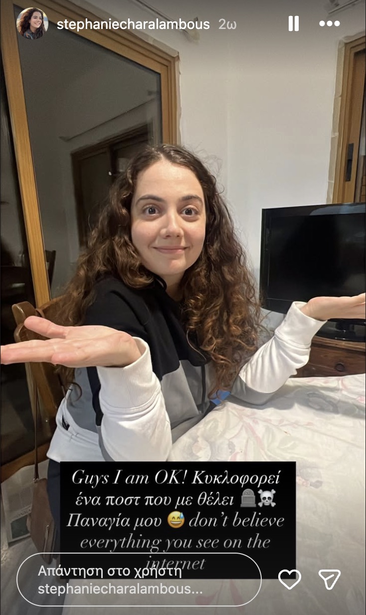 Η ίδια, σοκαρισμένη διέψευσε αμέσως το ποστ, τονίζοντας πως είναι απολύτως καλά στην υγεία της: «Παιδιά είμαι καλά. Κυκλοφορεί ένα ποστ που με θέλει νεκρή. Παναγία μου. Μην πιστεύεις τίποτα από όσα βλέπεις στο internet» έγραψε στα προσωπικά της social media.