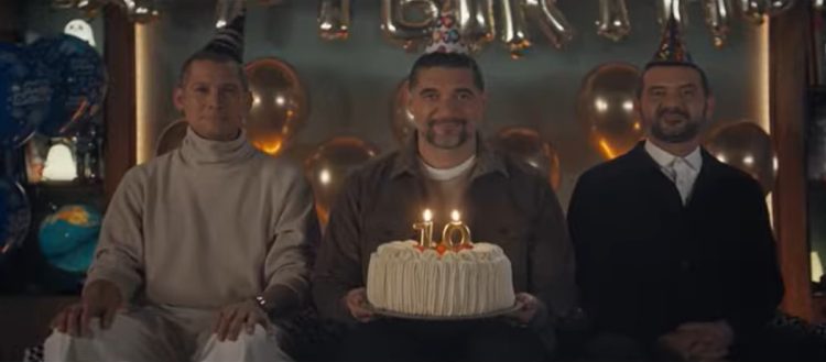 Λεωνίδας Κουτσόπουλος, Πάνος Ιωαννίδης και Σωτήρης Κοντιζάς κρατούν μία τούρτα γενεθλίων με τον αριθμό 10 και εύχονται στο μικρό αγόρι.