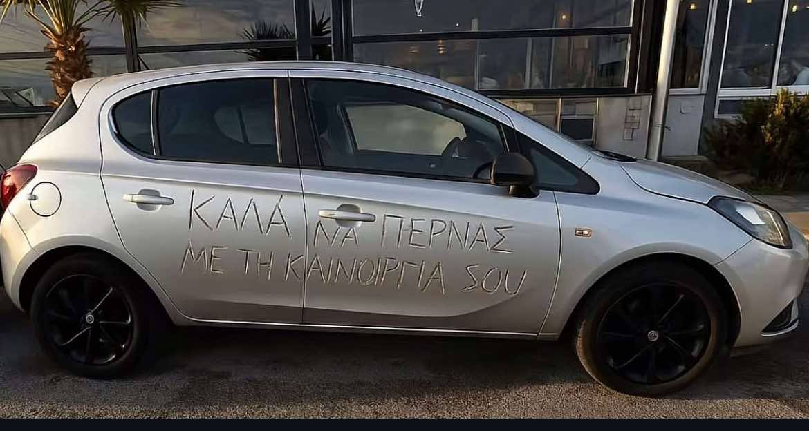 Σίγουρα ο κάτοχος του αυτοκινήτου δε θα χάρηκε τόσο όταν το είδε αλλά η κοπέλα που το έγραψε δεν είπε κάτι κακό αλλά «Καλά να περνάς με την καινούργια σου». Ωστόσο μάλλον δε χώραγε το ύψιλον στο «κανούργια» και σου λέει από το να το χάσω τελείως ας το κάνω… «καινοίργια».