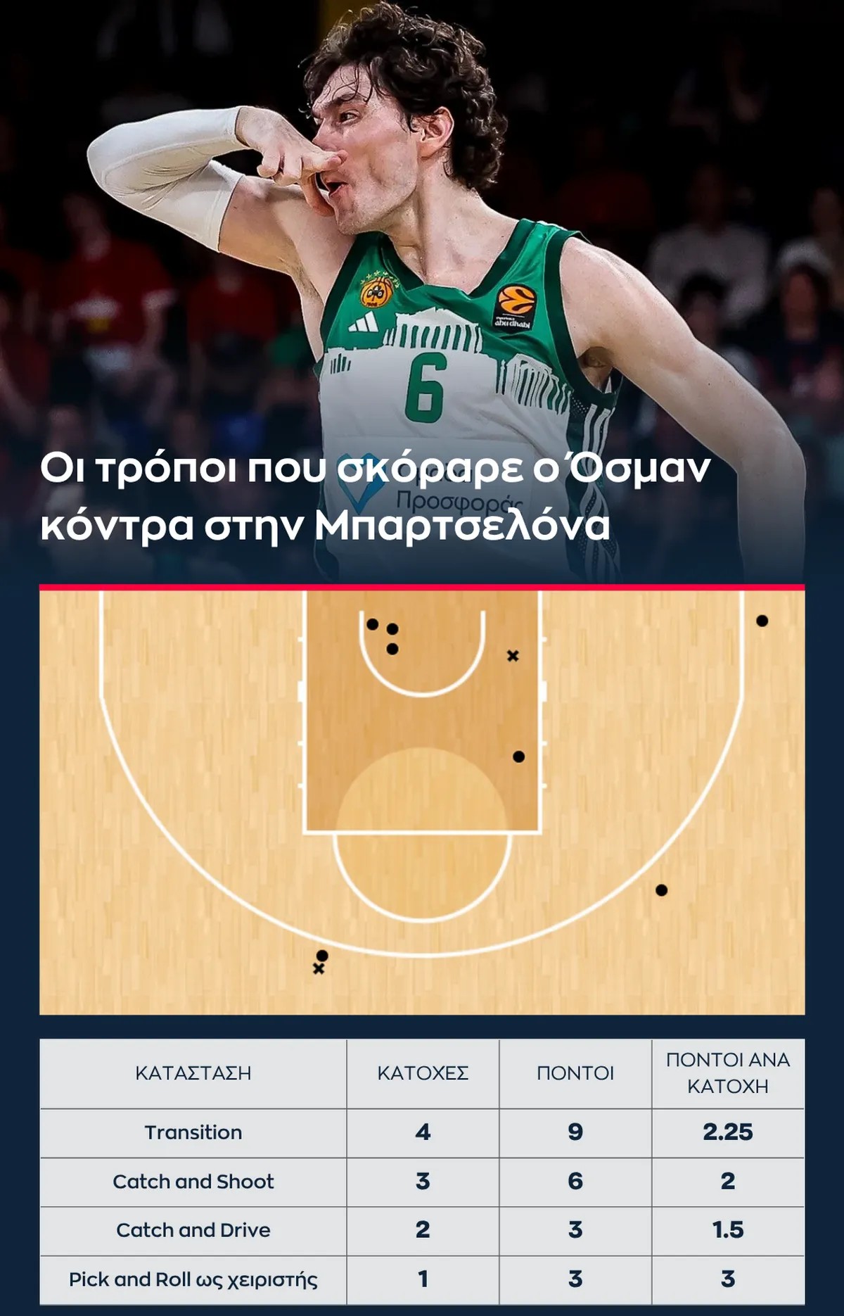 Ο Παναθηναϊκός AKTOR σημείωσε 16 από τους 27 πόντους της πρώτης περιόδου στα πρώτα 10’’ της επίθεσης — και οι 9 από αυτούς ήταν δικοί του. Ο δρόμος είχε στρωθεί. Η Μπαρτσελόνα δεν πρόλαβε να ανασάνει.