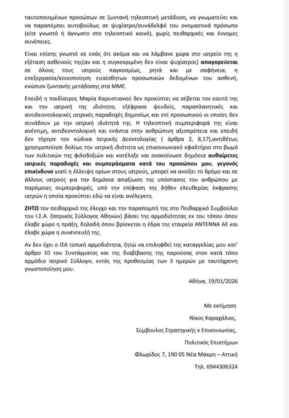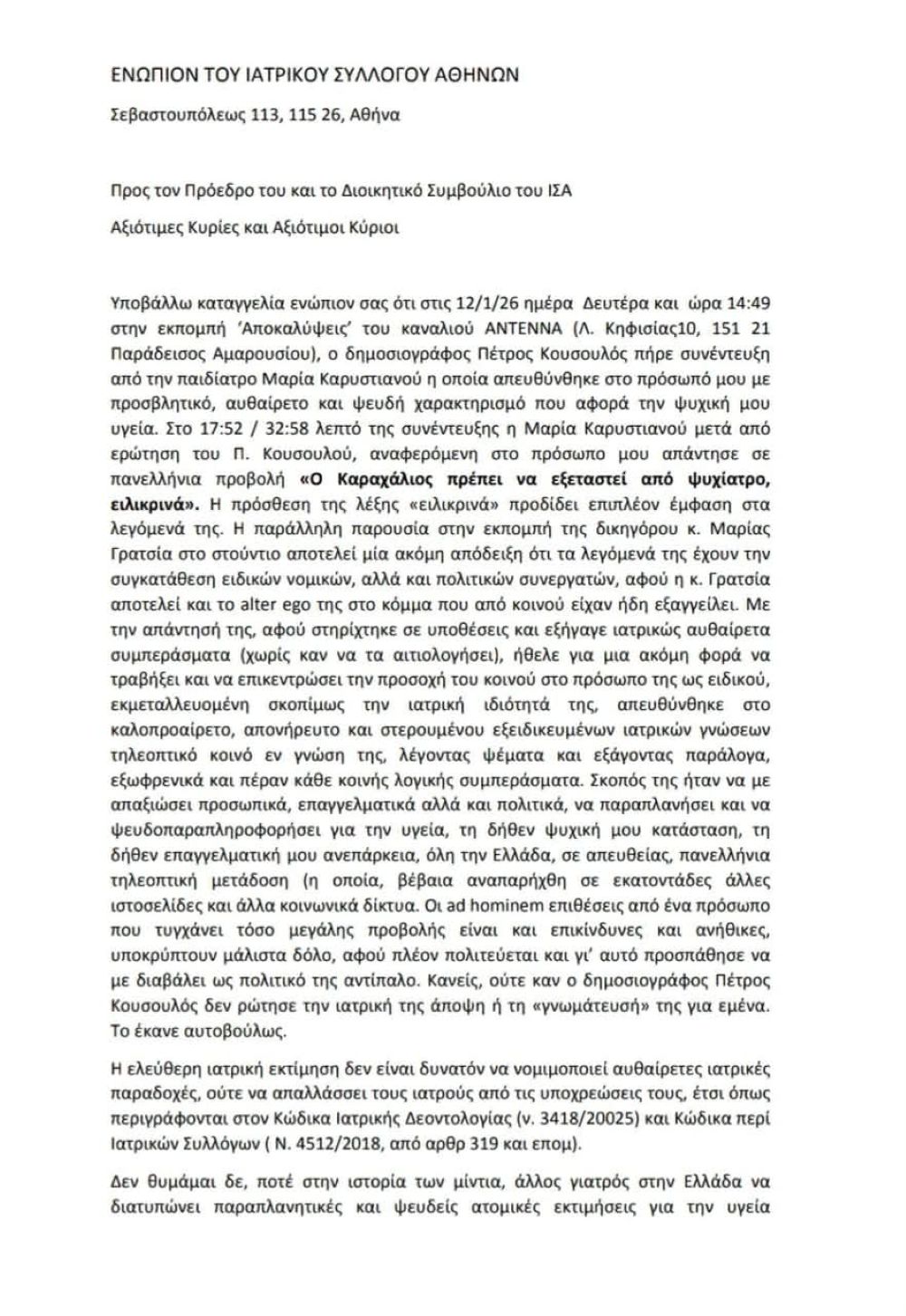 «Καταγγέλλω την κυρία Καρυστιανού. Σήμερα υπέβαλα την καταγγελία στον Ιατρικό Σύλλογο Αθηνών (αριθμός πρωτοκόλλου 337 – αριθμός υπόθεσης 120), καθώς εδώ διαπράχθηκε αδίκημα. Ένας γιατρός δεν μπορεί δημοσίως να προβαίνει σε τέτοιες αναφορές, και εάν το κάνει, είτε δεν γνωρίζει τις υποχρεώσεις του είτε το πράττει σκόπιμα», δήλωσε ο πρώην επικοινωνιακός σύμβουλος των πρωθυπουργών Κώστα Καραμανλή και Αντώνη Σαμαρά.