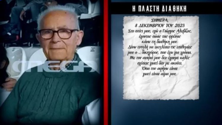«Σήμερα, 8 Δεκεμβρίου του 2023 στο σπίτι μου, εγώ ο Γιώργος Αλεβίζος έχοντας σώας τας φρένας κάνω τη διαθήκη μου. Δίνω εντολή να εκτελέσει τις επιθυμίες μου ο … δικηγόρος, που έχω για χρόνια. Με τον ανιψιό μου δεν έχουμε καλές σχέσεις γιατί δεν με ακούει. Όσα του αφήνω είναι γιατί είναι αίμα μου. Αν είναι αγνώμων, δεν θα πάρει τίποτα. Του αφήνω το σπίτι μου στην Παλαιό Παναγιά, το σπίτι και το Γιούρτι στην περιοχή Ελατού. Επίσης, του αφήνω το αυτοκίνητό μου και 50.000 ευρώ. Την υπόλοιπη περιουσία μου, όση και να είναι θα πάρουν από μισή η οικιακή βοηθός και ο δικηγόρος που είναι εγγονός της μαμής. Επιθυμία μου είναι από αυτή τη περιουσία και στη μνήμη μου να διαθέτουν κατά τη κρίση τους ποσά για αγαθοεργίες».