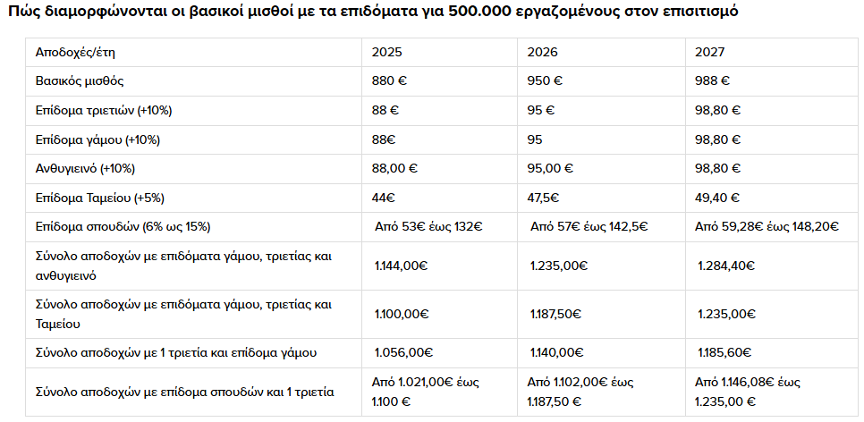 Για εργαζομένους με επιδόματα γάμου, τριετίας και ανθυγιεινό, οι μηνιαίες αποδοχές από 1.144 ευρώ θα ανέρχονται στα 1.235 ευρώ το 2026 και στα 1.284 ευρώ το 2027.