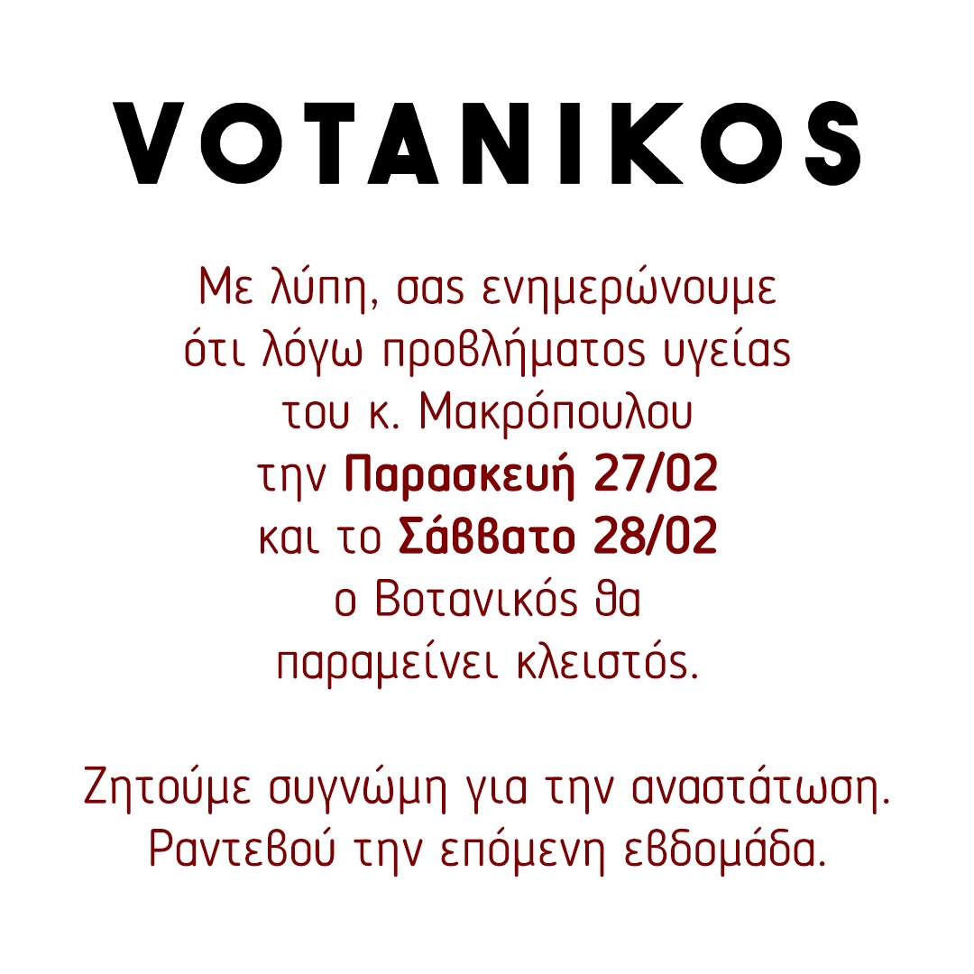 Όπως αναφέρεται στην ανακοίνωση του νυχτερινού κέντρου, που δημοσιεύτηκε στο Facebook: «Με λύπη, σας ενημερώνουμε ότι λόγω προβλήματος υγείας του κ. Μακρόπουλου την Παρασκευή 27/02 και το Σάββατο 28/02, ο Βοτανικός θα παραμείνει κλειστός. Ζητούμε συγγνώμη για την αναστάτωση. Ραντεβού την επόμενη εβδομάδα».