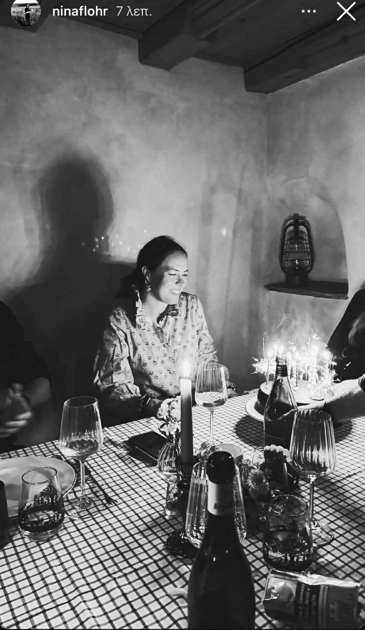 Σε μία από τις φωτογραφίες, η Νίνα Φλορ χαμογελά καθώς σβήνει τα κεράκια της τούρτας, συνοδεύοντας τη λεζάντα: «Τα σημάδια για μία ωραία βραδιά».