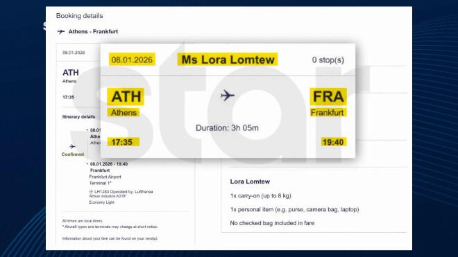 Στο επίκεντρο της έρευνας βρίσκεται το αεροπορικό εισιτήριο στο όνομά της, το οποίο αποκάλυψε το Star. Σύμφωνα με τα στοιχεία, η πτήση αναχώρησε από το αεροδρόμιο «Ελευθέριος Βενιζέλος» στις 17:35 και προσγειώθηκε στη Φρανκφούρτη τρεις ώρες και πέντε λεπτά αργότερα. Παρά το εισιτήριο, δεν έχει ακόμη επιβεβαιωθεί επισήμως αν η Λόρα επιβιβάστηκε στο αεροπλάνο.