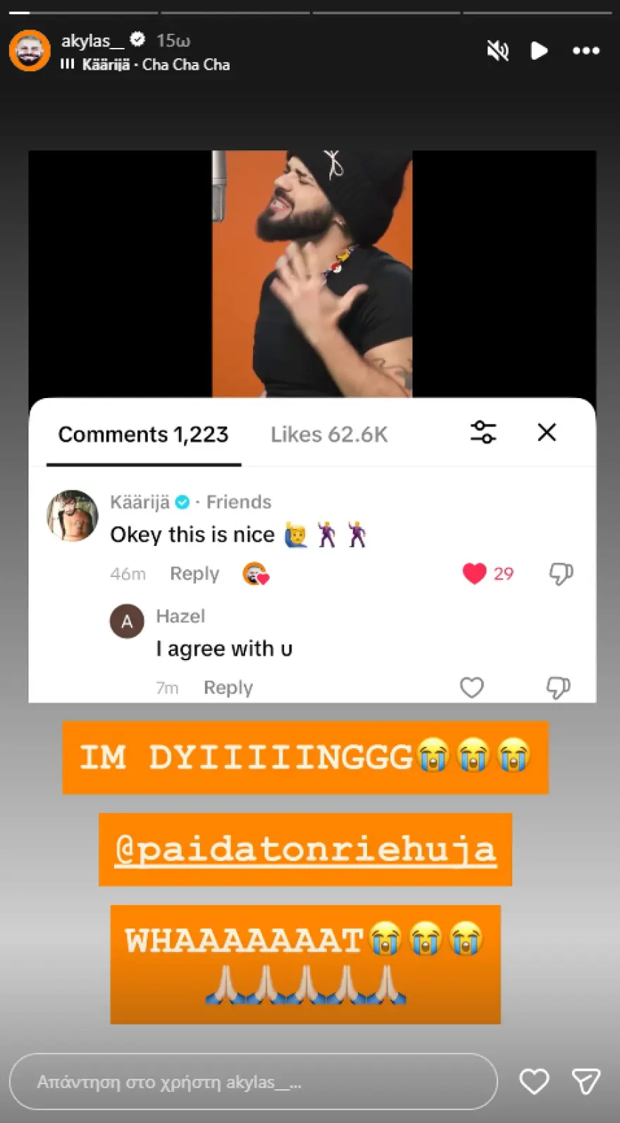 Και ναι, αυτό ήταν αρκετό για τον Akyla να τρελαθεί. Πραγματικά, λίγες λέξεις, αλλά μεγάλο impact. Την Πέμπτη, ο Έλληνας τραγουδιστής μοιράστηκε το σχόλιο στο Instagram Story του και… έγραψε μόνο μία λέξη: