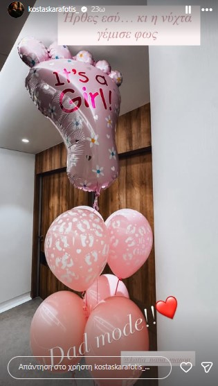 Ο δημοφιλής καλλιτέχνης, φανερά συγκινημένος, ανέβασε μια τρυφερή φωτογραφία στον προσωπικό του λογαριασμό στα social media, στην οποία πρωταγωνιστούσαν εντυπωσιακά ροζ μπαλόνια μέσα από το μαιευτήριο, «προδίδοντας» έτσι το φύλο του μωρού.